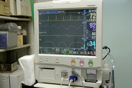 心電図、動脈血酸素飽和度、呼吸(炭酸ガス濃度)、麻酔ガス濃度、血圧、体温の同時測定だけでなく、呼吸の一回換気量および分時換気量まで測定できる装置を用いて、より安全な手術に取り組んでいます。