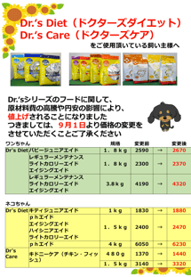 Dr.'sシリーズのフードに関して、原材料費の高騰や円安の影響により、値上げされることになりました。つきましては、9月1日より価格の変更をさせていただくことご了承ください。
