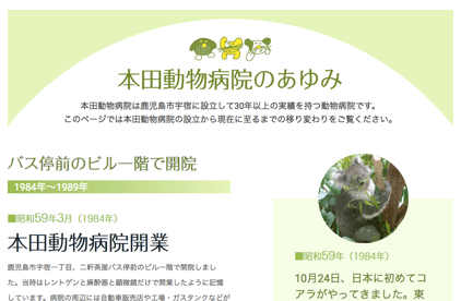 病院の設立から現在に至るまでの移り変わりを時代の流れとともにご覧いただけるページ「本田動物病院のあゆみ」を作成しました。