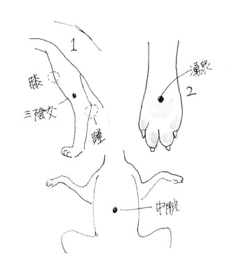 後肢の内側で、踵と膝を結ぶ線上の踵から2/5の位置にあるツボ。親指と人差し指で踵の両側から挟んで、上に持ち上げるように指圧します。(両側とも3~5回) -